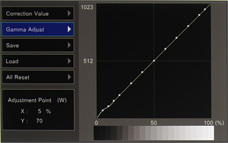 продвинутая настройка гривой гамма-коррекции (4 встроенных и 1 пользовательский редактируемый профиль — выбор показателя и поточечная правка гамма-кривой общей и по цветам в раздельности),