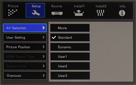 Меню имеет строгое и лаконичное оформление под стать дизайну самого проектора.