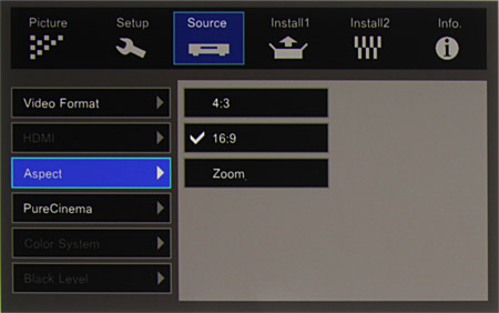 В случае HD-сигналов можно только включить режим V-Stretch, который немного растягивает картинку по вертикали так, что полосы при формате 2,35:1 уходят за область проекции, при этом для восстановления правильных пропорций нужно использовать опциональный анаморфотный объектив. При подключении по HDMI и сигналах с «компьютерными» разрешениями (например, 1024 на 768 пикселей) картинка может быть пропорционально увеличена с сохранением исходных пропорций (режим Normal), растянута на всю область проекции до соотношения 16:9 (Full) или выведена без интерполяции (Dot By Dot).