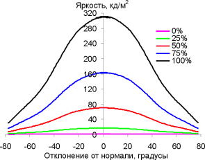 Графики показывают, что яркость экрана плавно падает при отклонении от нормали к экрану, при этом графики полутонов не пересекают друг друга, а контрастность изображения остается достаточно большой, вплоть до ±78 градусов (156 в сумме) отклонения от перпендикуляра к экрану.