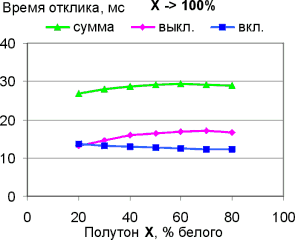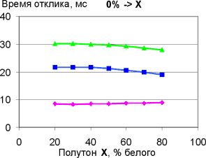 Мы измерили времена отклика при переходах от черного к белому и между полутонами. В случае полутонов мы проводили три вида измерений: для фиксированного полутона (X) измеряли время отклика при переходе от черного до X, от X до белого, и для перехода между полутонами в окрестности X, отстоящими от X на фиксированное значение (мы выбрали его равным 10%, так как считаем 20% минимальной имеющей значение разницей между полутонами).