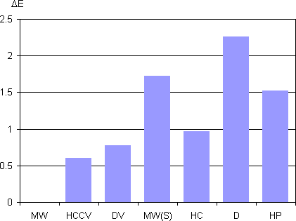 Полученные спектры отражения пересчитывались в цветовые координаты, которые использовали для расчета ΔE точки белого относительно полотна Matte White (MW).