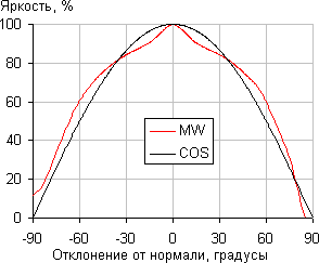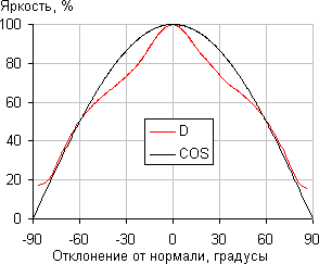 Зависимость относительной яркости изображения от отклонения угла падения света от нормали к плоскости экрана. Для сравнения на графиках приведена функция косинуса (кривая черного цвета):