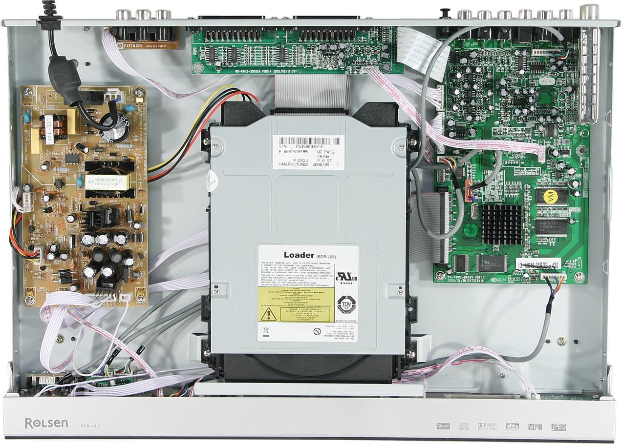 Видимо, пустующая площадка, предназначена для микросхемы NICAM-декодера. На плате присутствуют 3 ОУ D4558, усиливающие и фильтрующие аудиосигнал от ЦАПа. ТВ-РЧ-сборка — это традиционная JS-6B2F/L121-D5 от XuGuang. DVD-привод очень похож на обычный компьютерный, но в облегченном корпусе, он маркирован как BDR-L08 (Smartpro Int.). Монтаж очень аккуратный. Правда, шлейфы и кабели, не закреплены. Нагретый воздух выходит из рекордера через щели на боковых поверхностях кожуха.