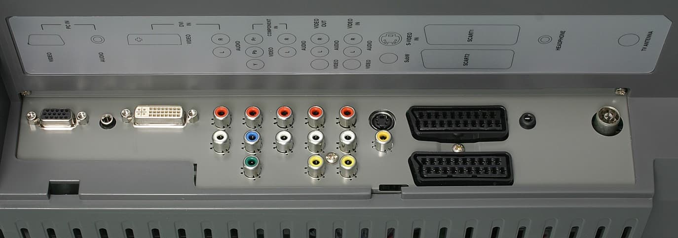 От россыпи разъемов RCA поначалу глаза разбегаются. Приходится аккуратно разбираться, сверяясь с наклейкой, какой разъем к чему относится. Практически каждому видеовходу соответствует свой аудиовход (гнездо миниджек для VGA, в SCART-ах для них же и в виде пары красно-белых RCA для остальных). Композитный видеосигнал и аудиосигнал текущего ТВ-канала передаются на соответствующие разъемы RCA. Подключение к видеотехнике с HDMI-выходом потребует кабеля-переходника с DVI на HDMI. HDCP телевизор поддерживает. Подключать наушники неудобно, но при отсутствии крышки на нише с разъемами это сделать можно, не поворачивая телевизор задней стенкой к себе. VGA-разъем расположен очень близко к стенке ниши, поэтому фиксировать на нем ответную часть винтовыми зажимами очень неудобно.