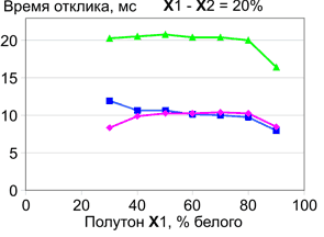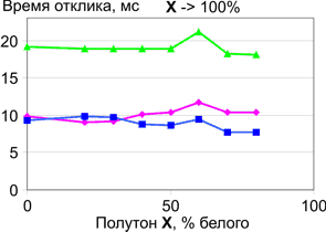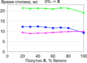 | Времена отклика при переходе между полутонами с разницей 20%. | |
