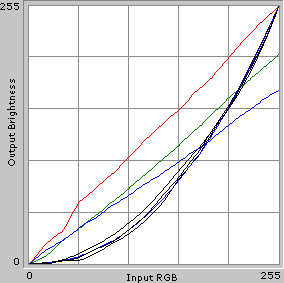 Цветовая температура на различных участках шкалы серого варьируется несильно, но она выше целевых 6500 К, особенно в случае RL-26D50D. То есть цвета телевизоров холодные. Далее приведены графики гамма-кривых, где можно увидеть, насколько гамма-кривые индивидуальных цветов (черные линии) отклоняются от целевой гамма-кривой (синяя линия), и какая требуется коррекция для каждого цвета (соответственно, красная, синяя и зеленая линии).