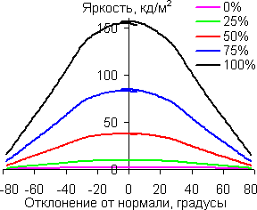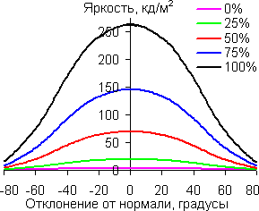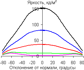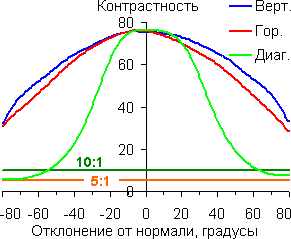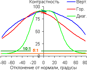 Графики показывают, что яркость экрана при выводе белого цвета и оттенков серого плавно меняется при отклонении от нормали к экрану по горизонтали и по вертикали, при этом графики полутонов не пересекают друг друга. Контрастность, как в горизонтальном, так и в вертикальном направлениях остается высокой вплоть до 78 градусов (156 в сумме). В диагональном направлении из-за значительного увеличения яркости черного поля контрастность уже при 50-60 градусах становится меньше 10:1, и при 78 градусах опускается почти до 5:1.