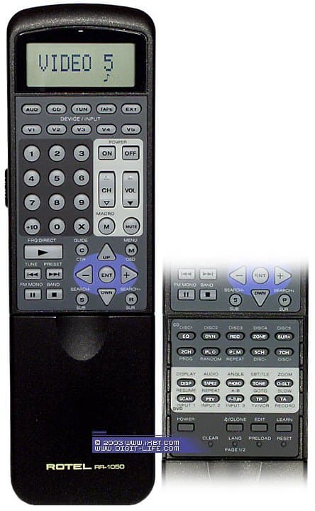 Пульт запрограммирован на управление компонентами Rotel, однако присутствует функция "обучения", позволяющая заставить работать этот пульт практически с любой техникой в доме, имеющей инфракрасный приёмник. Помимо управления AV-ресивером и DVD-плеером, можно записать в память команды ещё 8 разных пультов. Многих наверняка обрадует возможность перепрограммировать или обучить любую кнопку, а не только отведённую для этих операций группу кнопок. Есть и макро-команды (до 20 макро-команд, по 20 операций в каждой).
