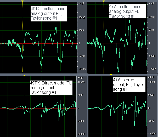 Аналогичная ситуация для другого мультиканального SACD James Taylor «Hourglass» 1997, песня «Line ‘Em Up» и для всех других. На картинке видно, насколько разные сигналы на дорожках — начало того же самого фрагмента в канале соответствующего уровня: