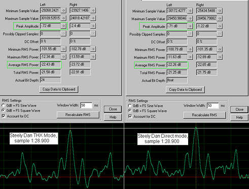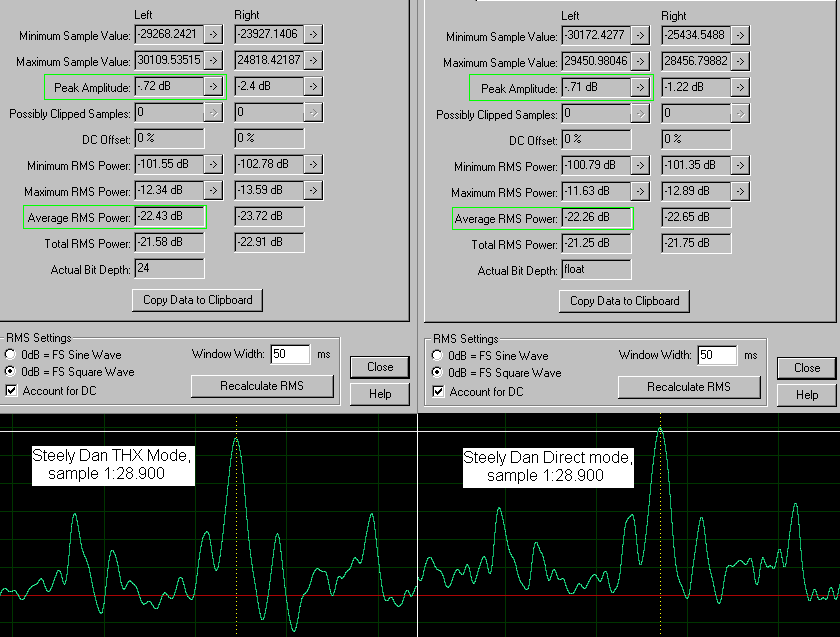 Замеры были сделаны настолько возможно точно — сэмплы по соответственным пикам сигналов и уровням согласованы (то есть, усилен один из сигналов в Adobe Audition, с обработкой его с разрешением 32 bit floating point 96kHz) и затем сделано сравнение.