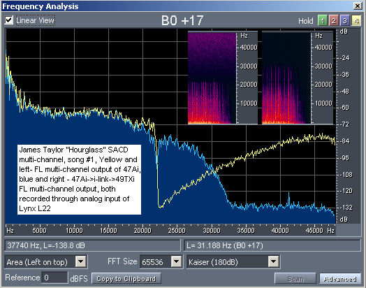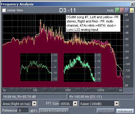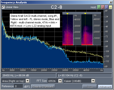 Обратите внимание на разницу в уровнях шумов и спектрах при воспроизведении мультиканальных дорожек с тех же самых дисков и со стерео дорожек. Видно, что обычно стерео дорожки сделаны со стерео источников, зачастую с ограничением полосы пропускания на уровне 22 кГц и ощутимо более высоким уровнем шумов. Мультиканальные дорожки, обычно полностью ремастеренные или записанные заново с 24 бит 96 кГц оригинальных мастер лент, отличаются совершенно другим уровнем качества сигнала. В свое время для многих было открытием существенная разница в качестве воспроизведения SACD multi-channel Dark Side of The Moon с использованием мультиканальных и стерео дорожек (SACD в обоих случаях), но после проведения измерений мы уже знаем, в чем дело.
