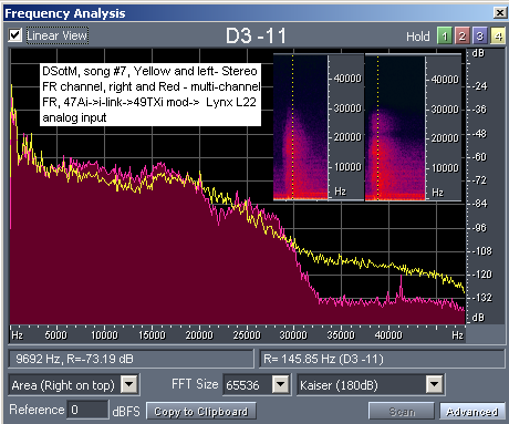Причем видимая на спектрограммах нижняя граница шума порядка -132 дБ для мультиканальной дорожки. Предположение о причине столь существенных отличий заключается не только в качестве аудиокарты, но и в фильтрации DVD-A/SACD плеером выходного сигнала, а также в разнице записанных сигналов на мультиканальных и стерео дорожках.