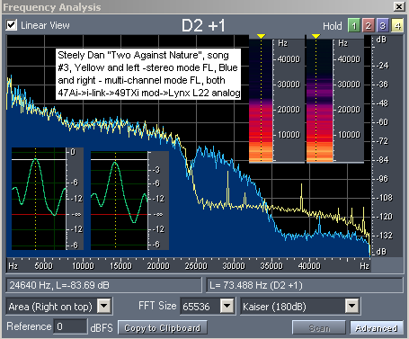 Далее исследования профессора показали, что на взятых взаймы SACD и DVD-A дисках, в частности Diana Krall и Steely Dan, НЕТ ультразвуковых образов выше 23 кГц, причем что интересно, пороговый уровень шума в FFT анализе на DVD-A Steely Dan достигает -72 дБ (странный DVD-A, у которого шумы на несколько десятков децибел хуже ограничения для CD-DA), а для SACD уровень шумов чуть лучше, то все равно достигает -78 дБ! Как-то непонятно, мы то ведь СЛЫШИМ качественное звучание этих дисков. Работа уважаемого профессора натолкнула на идею проделать повторные измерения, взяв те же самые имеющиеся в наличии диски SACD и DVD-A, добавив к ним другие.