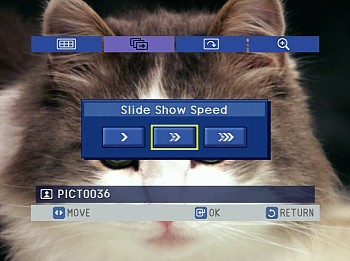 От длинных имен отображается почти три десятка символов; кириллица отображается адекватно; перемещаться по диску с файлами можно независимо от проигрывания; MP3-тэги не отображаются; быстрой перемотки по MP3-файлам нет; минимальная пауза между mp3-треками составляет примерно 1 сек; одновременно смотреть JPG-картинки и слушать mp3 нельзя. Набор функций для работы с картинками стандартный: индекс из 6-ти картинок, вращение, увеличение, слайд-шоу.