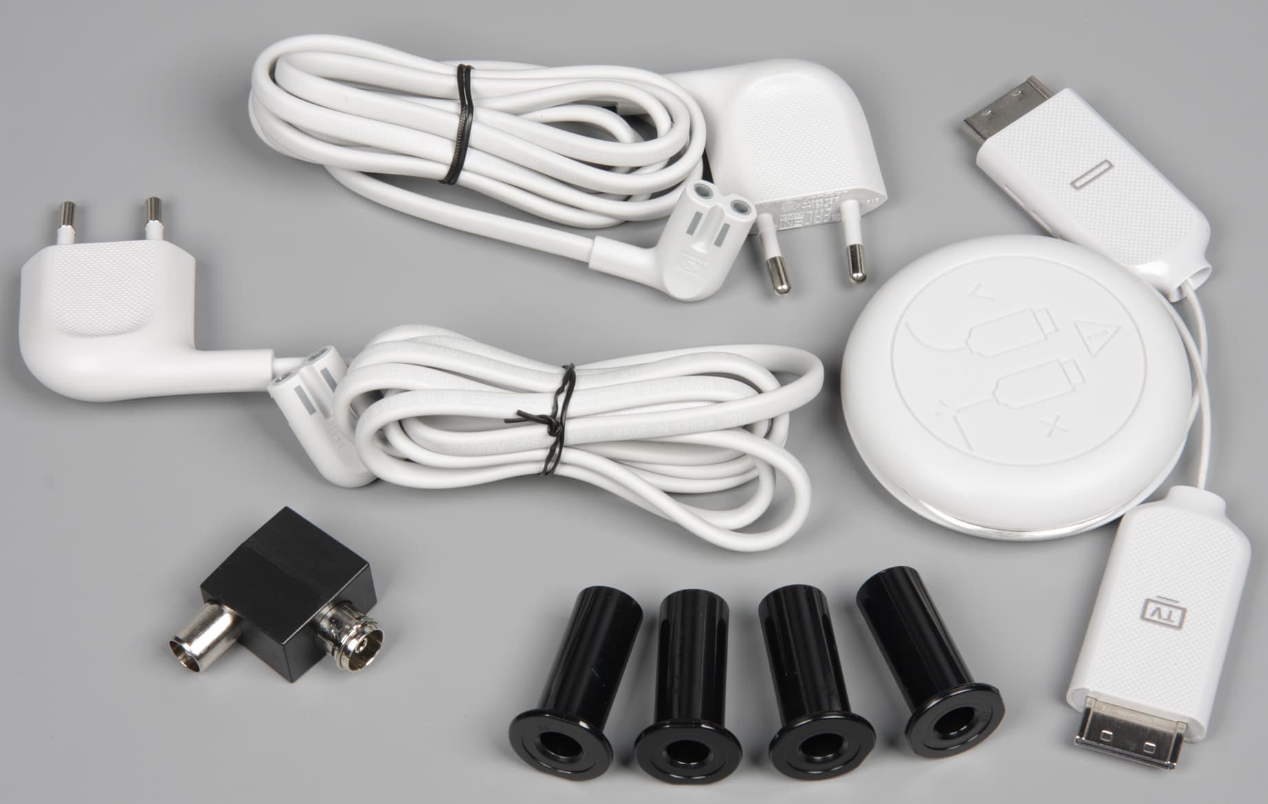 Модуль подключается к телевизору тонким (диаметр 1,7 мм) и длинным (примерно 5 м) оптоволоконным кабелем, изначально намотанным на катушку из упругого силикона. Также можно отдельно приобрести кабель длиной 15 м. С катушки нужно отмотать столько, сколько нужно, и положить ее где-нибудь рядышком. Разъемы на концах этого кабеля электрические, видимо, в них встроены оптические приёмопередатчики. Как указано в руководстве, нельзя допускать резких изгибов оптического кабеля, поэтому в местах возможных перегибов нужно уложить кабель в специальные направляющие уголки.