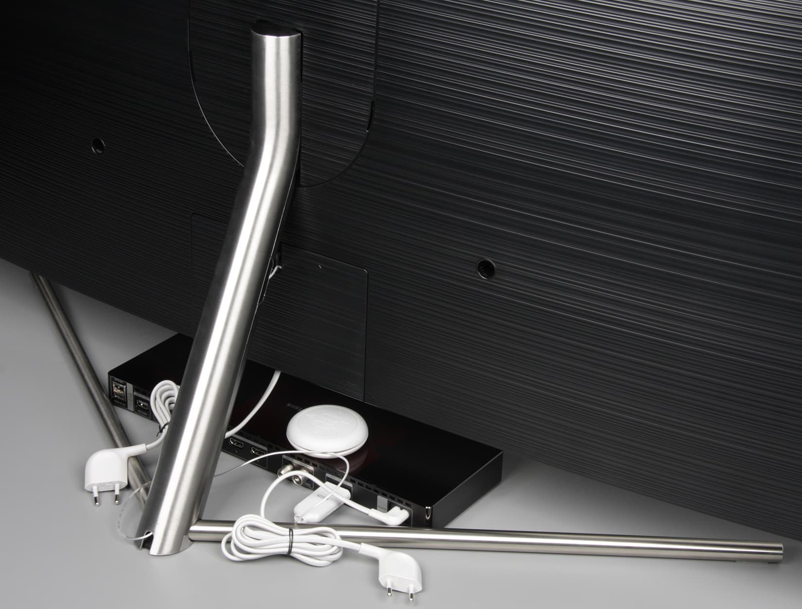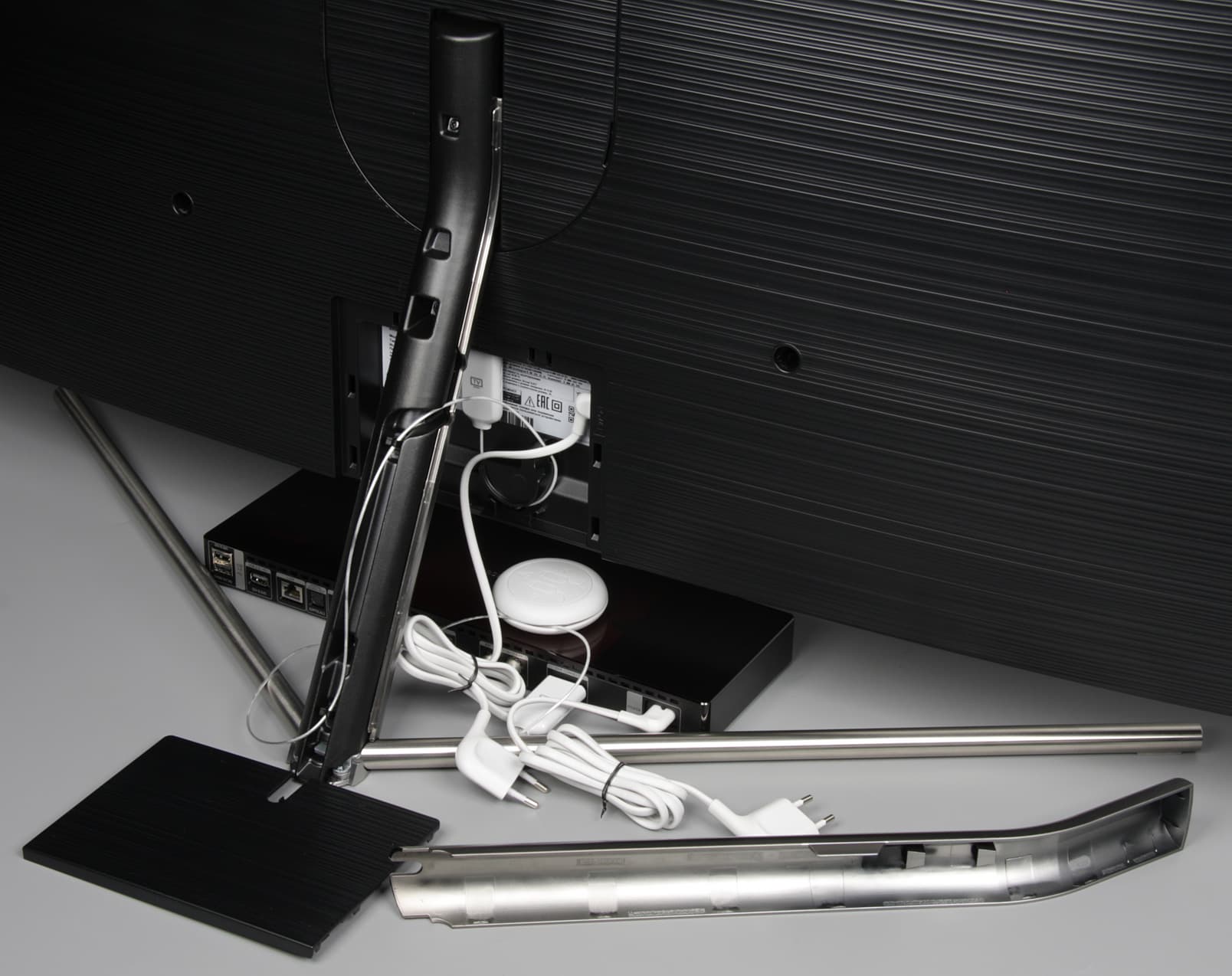 Внизу по центру обрамления закреплена небольшая прямоугольная алюминиевая планка с логотипом, который не подсвечивается. На нижнем торце под этой планкой есть накладка из прозрачного пластика. Там находятся единственная механическая кнопка, с помощью которой можно очень ограниченно управлять телевизором без помощи пульта ДУ, ИК-приемник пульта ДУ, датчик внешней освещенности и индикатор состояния. Индикатор неяркий, в дежурном режиме он горит красным. Тонкие (диаметр 17 мм) относительно размеров самого телевизора лучи основания подставки изготовлены из нержавеющей стали со шлифованной, но не полированной поверхностью. При этом данная V-образная конструкция является монолитной, что увеличивает ее прочность. Снизу на концах лучей, в месте, где они сходятся, а также на нижнем торце стойки наклеены резиновые противоскользящие накладки. К основанию подставки прикручивается стойка, изготовленная из алюминиевого сплава с черным матовым покрытием. Снаружи стойка прикрыта щитками из пластика с покрытием, имитирующим поверхность нержавеющей стали. Место, где стойка прикручивается к блоку экрана, закрывается щитком из пластика.