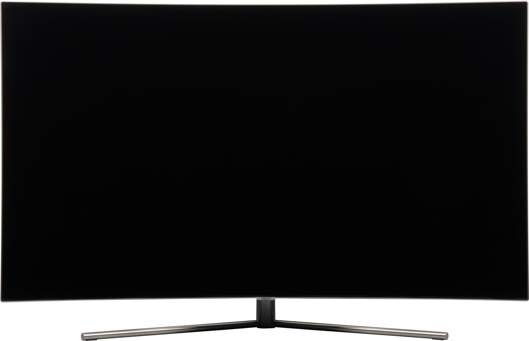 Дизайн строгий с уклоном в минимализм. Основное внимание дизайнеров было уделено оформлению задней поверхности и подставки. Это имеет смысл, так как с большой вероятностью данный телевизор с изогнутым экраном будет стоять на штатной подставке, при этом пользователю будет видно телевизор как спереди так, из-за изгиба экрана, и сзади (не во время просмотра, разумеется). Впрочем, на сайте производителя есть примеры интерьеров, в которых этот телевизор повешен на стену. Блок экрана выполнен в условно безрамочном стиле. Передняя панель представляет собой монолитный лист стекла с тонким обрамлением из алюминиевого профиля без покрытия и с матовой поверхностью.