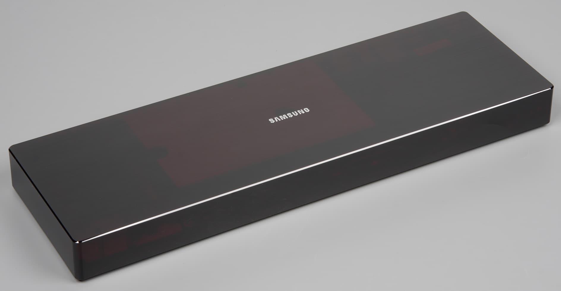 Вынос всех разъемов для подключения внешних устройств — это удобно, так как телевизор можно поставить в нишу или повесить на стену, где доступ к разъемам на задней панели будет затруднен, а модуль One Connect поместить в удобном для подключения периферии месте. Комплектные кабели питания белого цвета и имеют длину порядка 1,5 м, оснащены они компактными Г-образными вилками и разъемами. Корпус модуля One Connect изготовлен из пластика с матовой поверхностью. Сверху пластик прозрачный, но настолько плотно тонированный красным, что при обычном освещении выглядит черным, а днище модуля — из черного пластика. Видимо, сделано это для того, чтобы ИК-сигнал от пульта с большой вероятностью достигал приемников, размещенных в модуле. На днище есть вентиляционные отверстия, а по углам приклеены невысокие резиновые ножки, которые из-за выпуклости в центре едва достают до поверхности, на которой лежит модуль.
