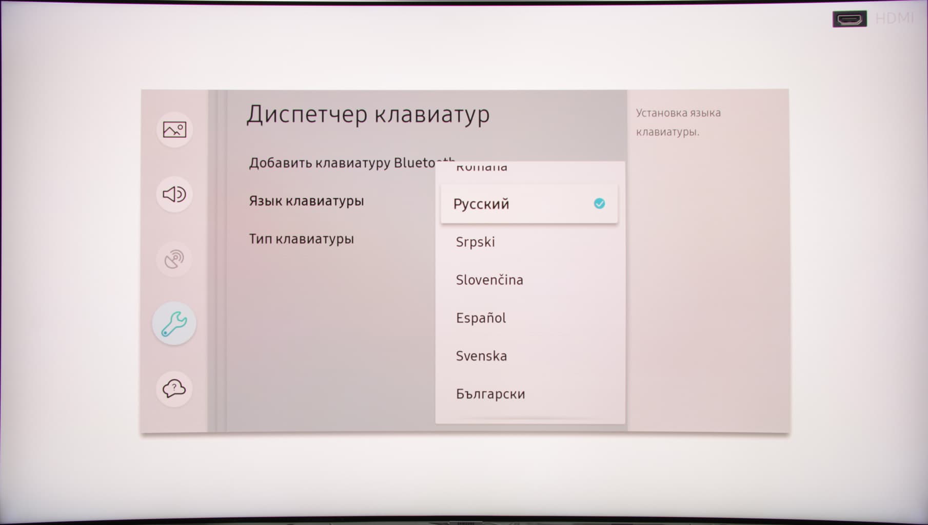 Функции координатного ввода, например гироскопической «мыши», у штатного пульта, к сожалению нет. Ограниченные в случае такого «умного» телевизора возможности пульта можно компенсировать, подключив к телевизору клавиатуру и «мышь». Эти устройства ввода работают даже через USB-разветвитель, освобождая дефицитные USB-порты под другие задачи. Правда мышь в интерфейсе самого ТВ не работает, курсор появляется только в некоторых программах. С проводными и беспроводными клавиатурами и мышами от разных производителей не возникло никаких проблем. Поддерживается прокрутка колесиком, а задержка перемещения курсора мыши относительно движения самой мышью минимальная. Для подключенной клавиатуры можно выбрать альтернативную раскладку, в том числе и кириллическую самого распространенного варианта, при этом поддерживается смена раскладки клавиатуры (клавишей Alt) на основную (английскую) и обратно на выбранную.