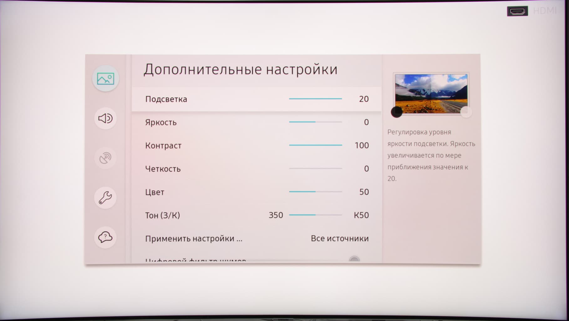 Некоторое неудобство заключается в том, что списки в меню не зациклены, поэтому добравшись до последнего пункта, часто приходится перематывать список обратно в начало, или выходить на уровень выше и снова заходить в список. Во время настройки изображения можно выбрать режим применения настроек ко всем входам, но, видимо, даже в этом случае что-то все равно настраивается индивидуально с привязкой к текущему физическому входу. В телевизор встроена объемная по содержанию интерактивная справочная система.