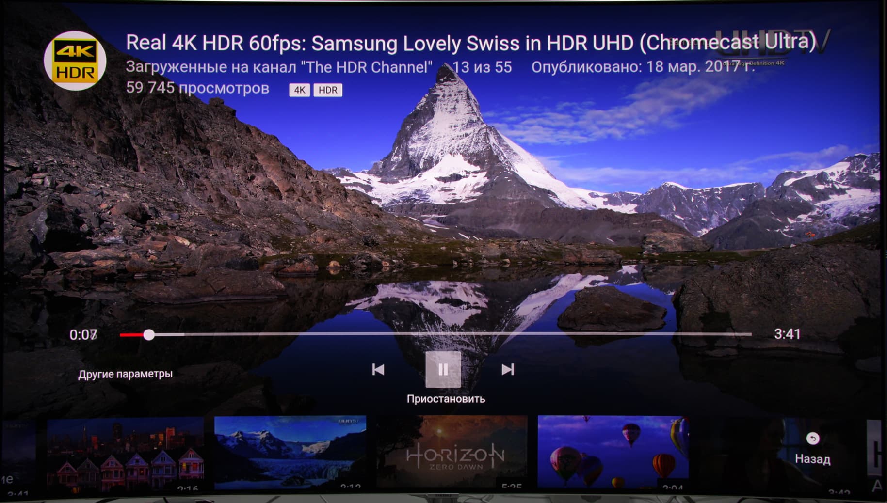 Отметим, что сама концепция HDR заключается не столько в расширенном яркостном диапазоне, сколько в способности устройства выводить изображение без артефактов в том диапазоне яркости, в котором оно в принципе способно показывать. Поддержка 10 бит на цвет как раз и исключает артефакты в виде видимых градиентов там, где их быть не должно. Кстати, в приложении YouTube удалось посмотреть видео в разрешении 4K с HDR и даже, вроде бы, с 60 кадр/с, впечатления очень хорошие.