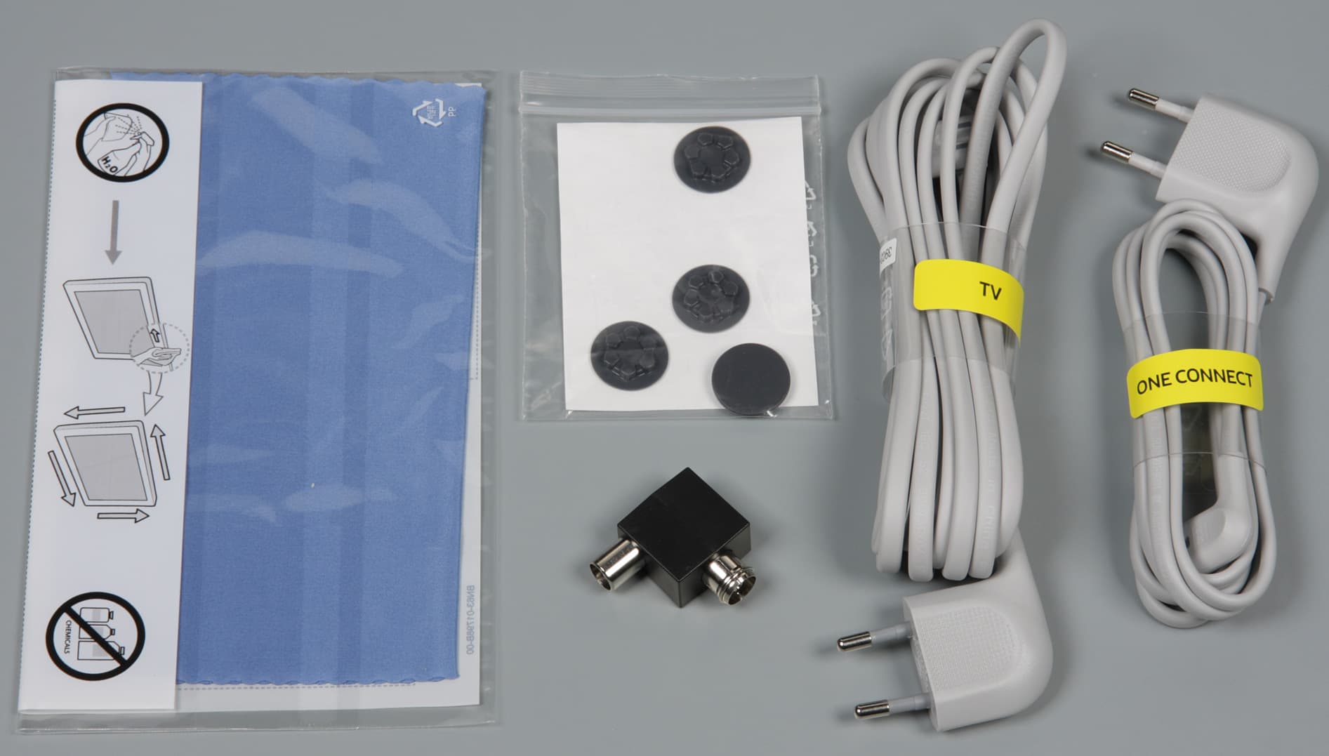 Модуль подключается к телевизору тонким (диаметр 1,8 мм) и длинным (примерно 5 м) оптоволоконным кабелем, изначально намотанным на катушку из упругого силикона. Также можно отдельно приобрести кабель длиной 15 м. С катушки нужно отмотать столько, сколько нужно, и положить ее где-нибудь рядышком. Разъемы на концах этого кабеля электрические, видимо, в них встроены оптические приёмопередатчики. Как указано в руководстве, нельзя допускать резких изгибов оптического кабеля, поэтому в местах возможных перегибов нужно уложить кабель в специальные направляющие уголки. Вынос всех разъемов для подключения внешних устройств — это удобно, так как телевизор можно поставить в нишу или повесить на стену, где доступ к разъемам на задней панели будет затруднен, а модуль One Connect поместить в удобном для подключения периферии месте. Комплектные кабели питания белого цвета и имеют длину порядка 1,5 м для модуля One Connect и 2,9 м для самого телевизора, оснащены они компактными Г-образными вилками и разъемами.