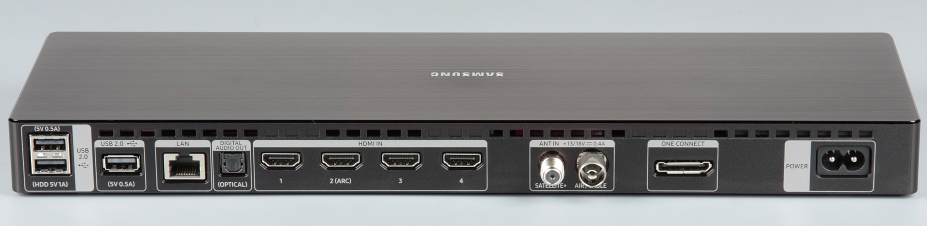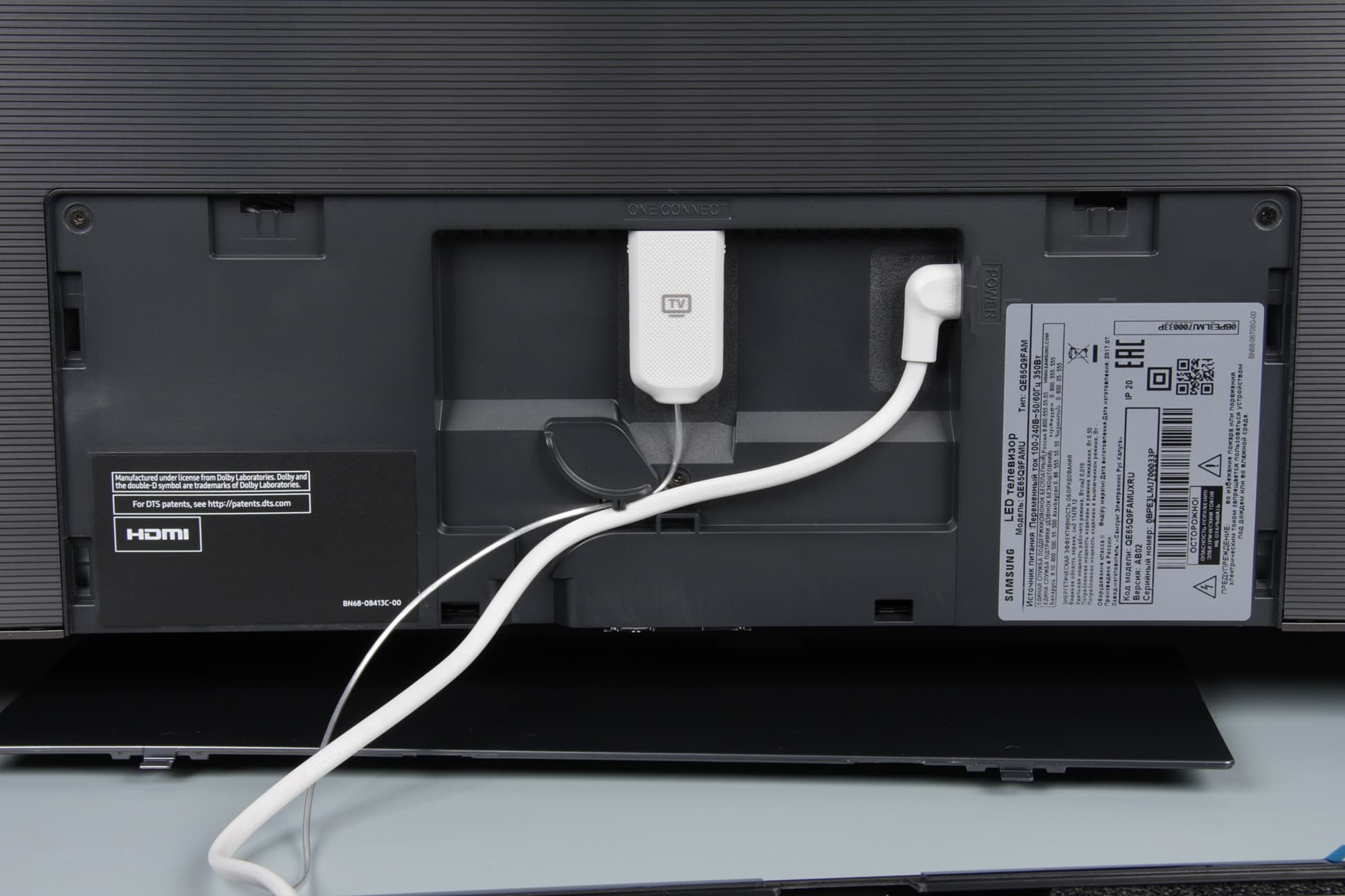Напомним, что в нише на задней панели телевизора всего два разъема — питания и от модуля One Connect, представляющего собой небольшую (362×115×32 мм) прямоугольную коробку.