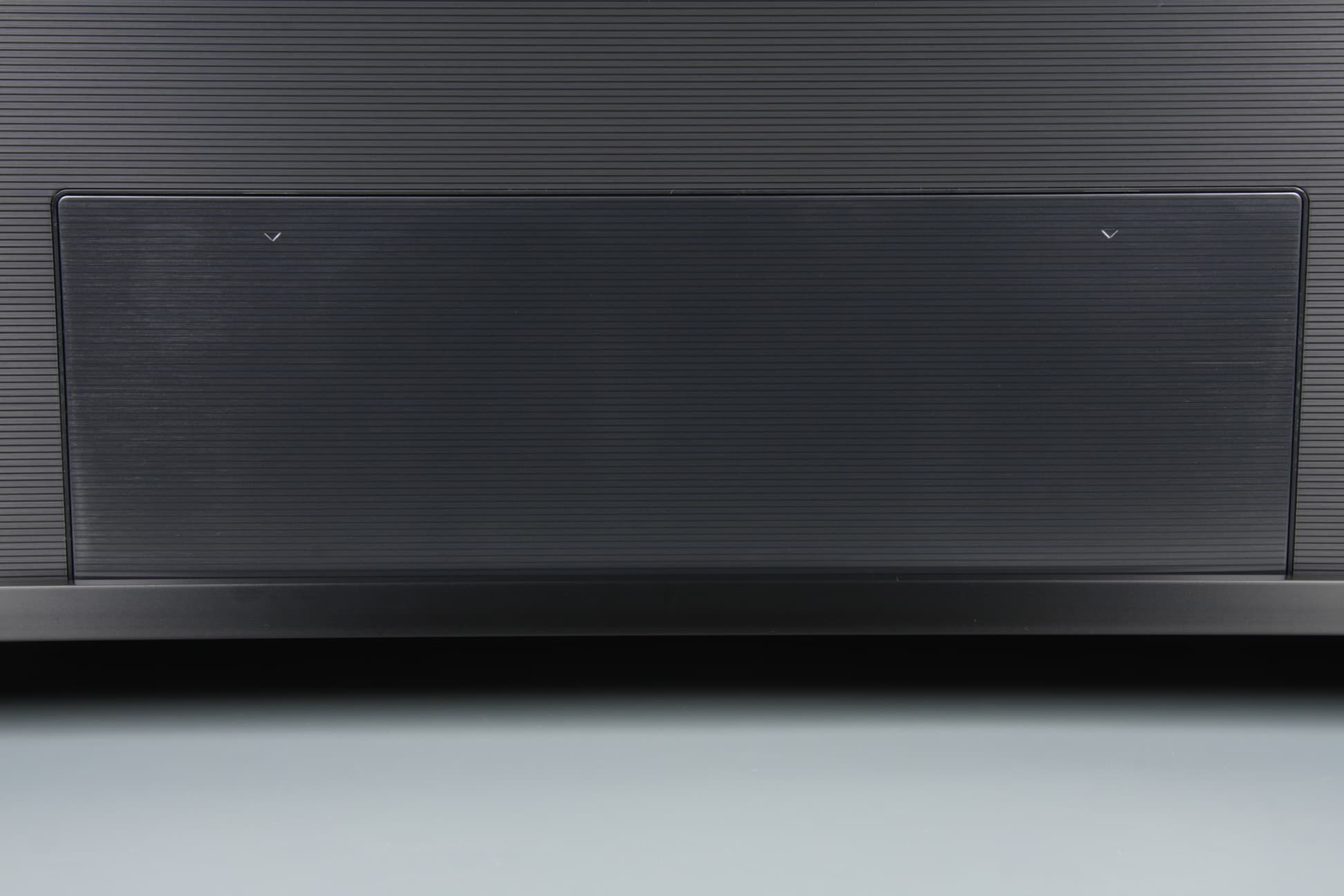 Внизу по центру обрамления закреплена небольшая прямоугольная алюминиевая соединительная вставка в цвет рамки по периметру. На фронтальной плоскости этой вставки есть логотип, выполненный в виде трафарета. Подложка под логотипом белая, она оснащена светодиодной подсветкой, которую можно отключить в меню установок. На нижнем торце вставки есть накладка из пластика, по большей части с блестящим металлическим покрытием. На накладке размещены единственная механическая кнопка, с помощью которой можно очень ограниченно управлять телевизором без помощи пульта ДУ, ИК-приемник пульта ДУ, датчик внешней освещенности и индикатор состояния. Индикатор неяркий, в дежурном режиме он горит красным.