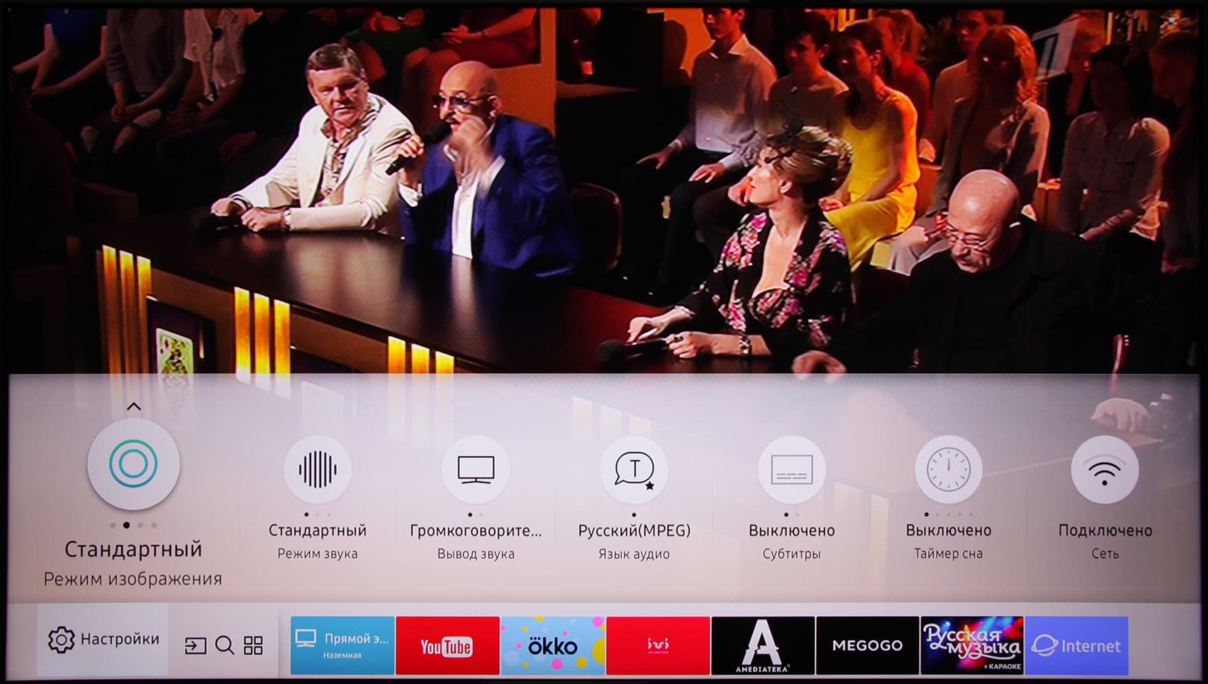 Отметим, что в целом ни к стабильности работы, ни к отзывчивости оболочки у нас никаких претензий не возникло. На команды с пульта ТВ реагирует почти моментально. Несмотря на разнообразную анимацию и звуковые эффекты, навигация по меню быстрая. Вот только возврат из меню с настройками к текущему просмотру выполняется в несколько шагов и через главный экран, ну или мы не разобрались, как это сделать быстро. Меню с настройками ТВ занимает большую часть экрана, надписи в нем читаемые. Есть русифицированный вариант интерфейса. Качество перевода хорошее, и самое главное, что настройки в большинстве случаев меняют именно то, что ожидаешь, исходя из их наименования.
