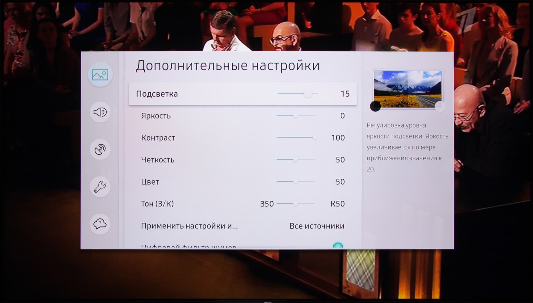 Непосредственно при регулировке параметров изображения на экран выводится уже только название настройки, ползунок и текущее значение или список вариантов, что облегчает оценку влияния этой настройки на изображение, при этом настройки с ползунками перебираются стрелками вверх и вниз.