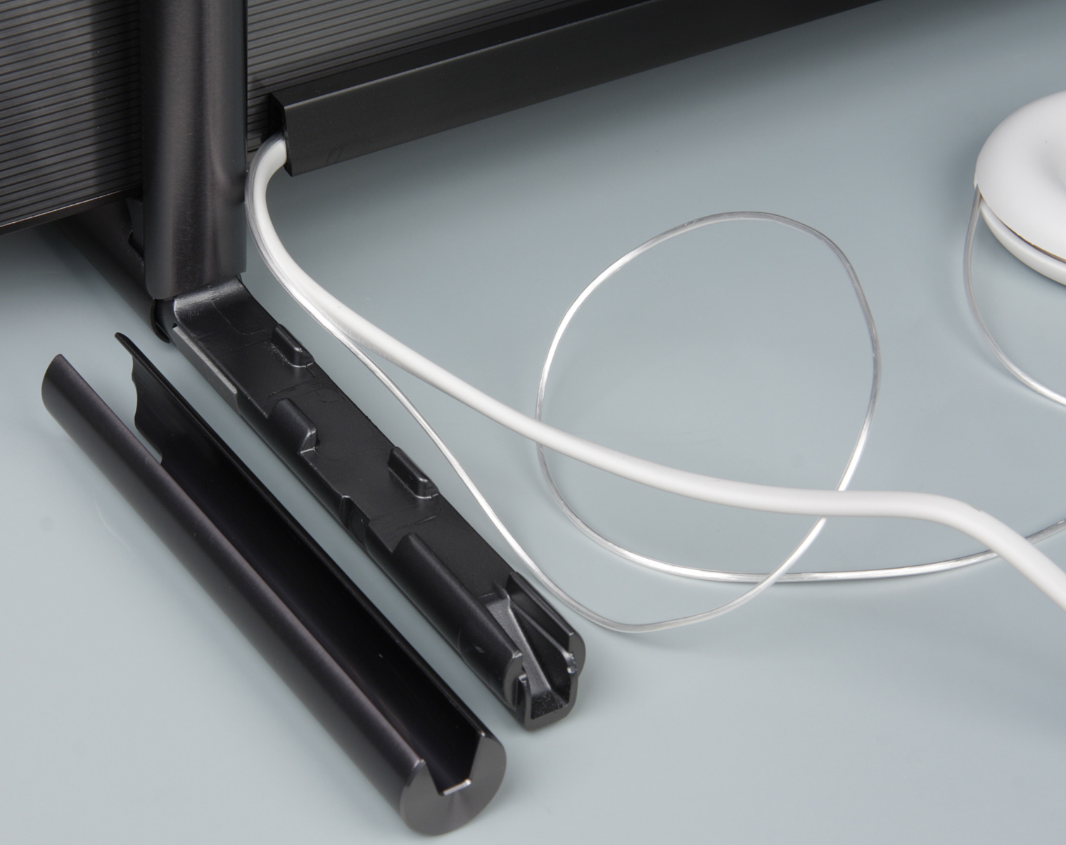 И конечный результат — надвинутый на ножку кожух фиксирует кабели на месте и скрывает их.