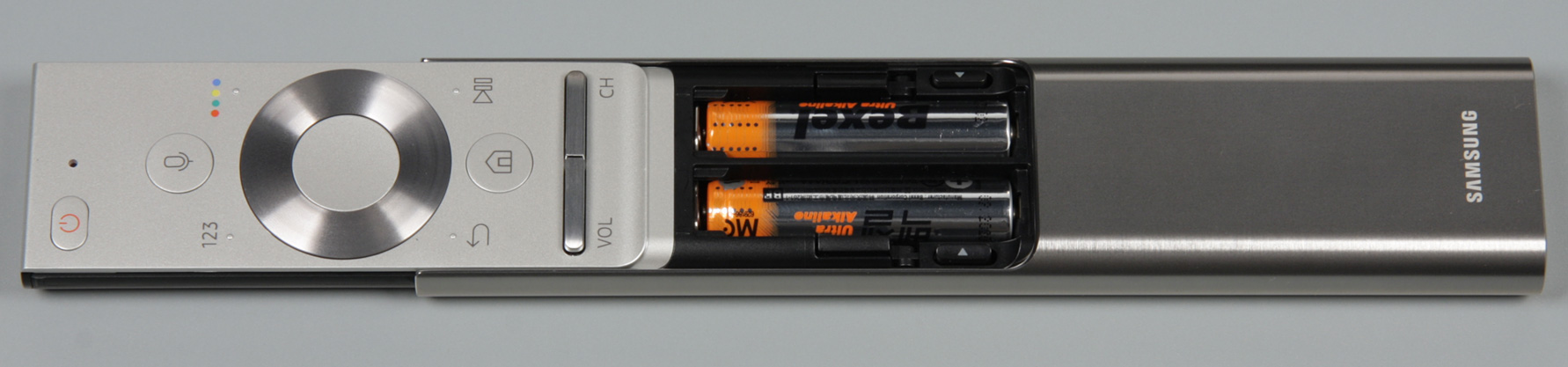 Пульт имеет оригинальную конструкцию. Нажав на кнопочку снизу, можно сдвинуть назад алюминиевый кожух.