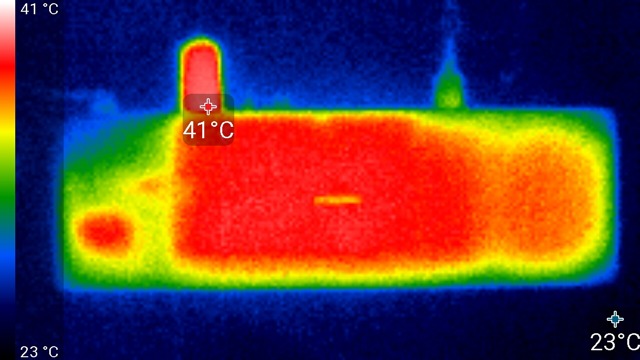 Видно, что основных источников тепла два — светодиодные линейки по бокам экрана. Максимальный нагрев локальных участков спереди составил 43 °C. Поверхность корпуса модуля One Connect при этом нагревается максимум до 38 °C, но корпус разъема One Connect греется уже до 42 °C.