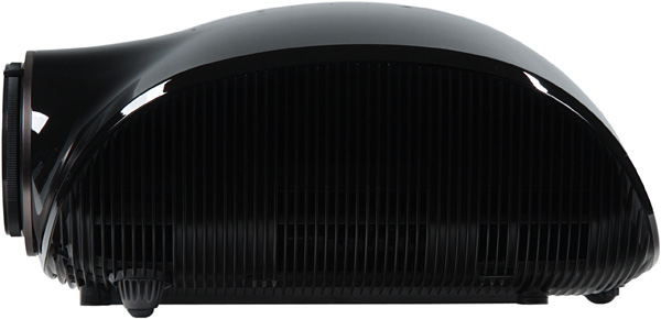 Внешне проектор очень напоминает модель Samsung SP-A800B, но корпус SP-A600B несколько меньше и объектив расположен не по центру. Верхняя часть корпуса изготовлена из черного пластика с зеркально-гладким покрытием, относительно устойчивым к царапинам. Нижняя ребристая — тоже из черного пластика, но с матовой поверхностью. Сверху можно обнаружить: три индикатора состояния (два неярко светятся синим при работе, в режиме ожидания — один, свечение при работе можно отключить), сенсорные кнопки, обозначенные подписями и/или выпуклыми значками и два логотипа. Кнопки адекватно реагируют на нажатие (его подтверждает писк, который можно отключить), подсветки не имеют, пользоваться ими на ощупь трудно, а на поверхности вокруг кнопок остаются заметные следы от пальцев. На левом боку находится воздухозаборная вентиляционная решетка.
