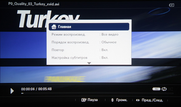 Для тестирования функции проигрывания видеофайлов мы использовали ряд тестовых файлов, в том числе файлы с DivXTestCD v2.0. Плеер проектора умеет проигрывать MPEG1/2-файлы, MPEG4-файлы (AVC и ASP) в контейнерах AVI, DivX, MP4, MKV и OGM, а также Windows Media Video 9 (WMV) разрешением до 1280 на 720 пикселей (кроме MPEG1/2). Поддерживаются Qpel, GMC, Bframes и т. д. Плеер распознает и воспроизводит звуковой поток в MPEG4-файлах, если он присутствует в форматах MP3 (2.0), AC3 (5.1), LC-AAC (2.0 и 5.1), Ogg Vorbis (только 2.0) и WMA9 (2.0 и 5.1), но переключаться между несколькими аудиодорожками нельзя. Встроенные субтитры не поддерживаются, но показываются внешние текстовые субтитры в форматах SRT и SUB без поддержки форматирования и переключения между файлами субтитров. При этом в одной строке отображается как минимум 50 символов и выводится как минимум 3 строчки. В контекстном меню есть много настроек, влияющих на вывод субтитров — выключение, включение фона, синхронизация, настройка положения по вертикали, размер и цвет шрифта и выбор языка, — вот только кириллица всегда отображается непонятной смесью символов. Настройки порядка и режима воспроизведения такие же как при воспроизведении графических и аудиофайлов.