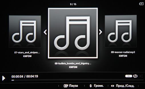 В режиме воспроизведение на экран выводятся три иконки — предыдущий, текущий и следующий файл — с названием файла и исполнителем под ними. Второй тип информации берется из тэгов MP3-файлов (кириллица должна быть в кодировке Unicode), а если в MP3-файл встроена картинка, то она выводится вместо абстрактного нотного знака.