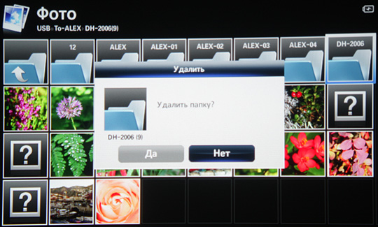 Выбрав режим воспроизведения, пользователь попадает на страницу файлового браузера. В списках отображаются только файлы, соответствующие выбранному на первой странице типу, а в скобках после названия папок указывается сколько таких файлов находится в этой папке. Кириллица в названиях файлов и папок отображается правильно. Если на носителе много (порядка нескольких тысяч) файлов, то первоначальная инициализация выполняется очень долго. При запуске файла на воспроизведение проектор создает список воспроизведения, что также может занимать некоторое время, особенно если включен режим воспроизведения всех файлов.