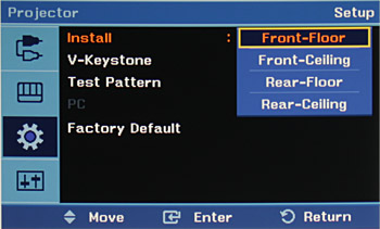 Фокусное расстояние фиксированное и не меняется. Проекция направлена вверх, так что нижняя граница изображения находится чуть выше оси объектива. Фокусировка изображения на экране производится ребристым колесиком на правом боку. Для облегчения настройки проекции на экран можно вывести один из нескольких тестовых шаблонов. В проекторе есть функция ручной цифровой коррекции вертикальных трапецеидальных искажений.