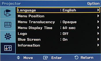 С подсоединением к источникам сигнала все просто: проектор оборудован стандартным VGA-разъемом (принимает только VGA-сигналы), RCA-разъемом для композитного входа и парой RCA, работающей как аудиовход. Источник сигнала выбирается с помощью кнопки SOURCE на корпусе проектора или на пульте, или в списке в меню. Там же в меню входам можно присвоить имена, выбрав их из имеющихся. Интерфейс USB используется, видимо, только в сервисных целях.