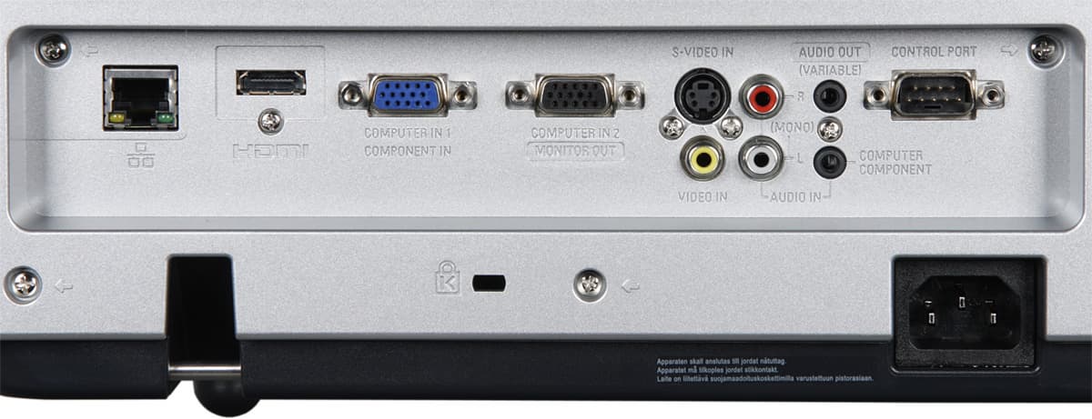Проектор оснащен типичным для презентационных проекторов набором аналоговых аудио/видео входов плюс HDMI-интерфейсом, принимающим также цифровой звук и, разумеется, совместимым с HDCP. В меню можно указать, что вход HDMI нужно использовать совместно с аналоговым аудиовходом,