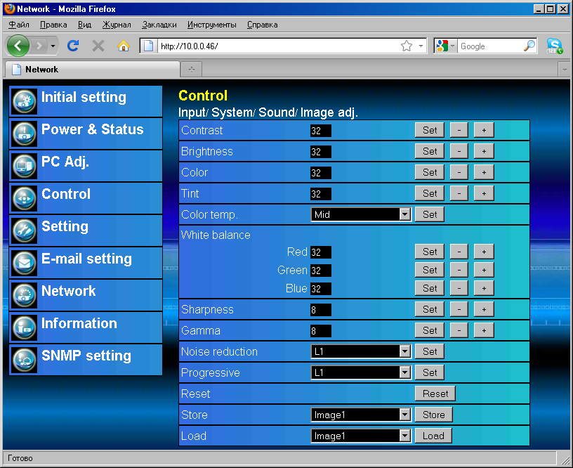 Есть автоматический поиск активного подключения с двумя режимами работы, при желании его можно отключить. Интерфейс RS-232 (стандартный D-Sub 9 pin), видимо, позволяет дистанционно управлять проектором. Для удаленного мониторинга нескольких проекторов и управления ими по сети передачи данных можно применять ПО, использующее команды дистанционного управления по сети спецификации JBMIA PJLink Class 1. С сайта производителя можно скачать программу-менеджер PJ Network Manager (только версия под Windows). Кроме того, контролировать состояние проектора и управлять им можно с помощью любого web-браузера, обратившись к встроенному в проектор HTTP-серверу.