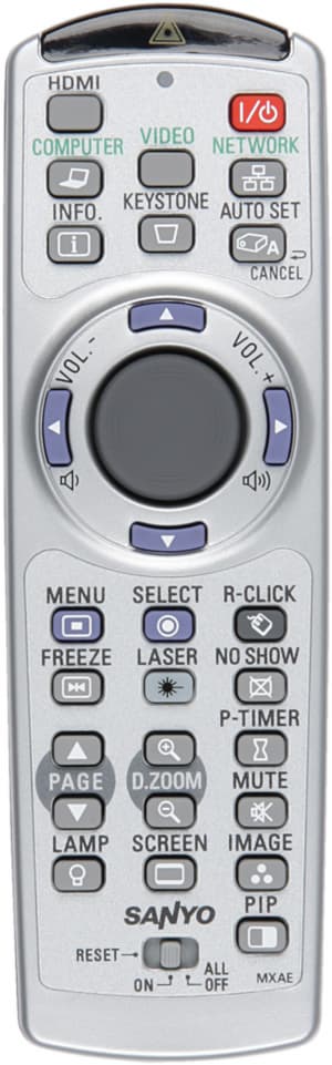 Кроме того, в пульт встроена лазерная указка красного свечения. Если проектор подключить к компьютеру по USB (используя разъем типа B), то с помощью данного пульта можно перемещать курсор мыши, эмулировать нажатие на ее левую (кнопка снизу) и правую кнопки, а также на кнопки Page Up/Down клавиатуры, что поможет дистанционно управлять презентацией и выполнять другие действия.