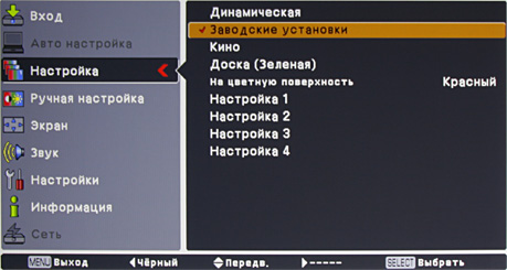 Два профиля оптимизированы для проекции на цветную поверхность (один на школьную доску зеленого цвета, во втором цвет можно выбирать). Изображение настраивается с помощью типичного набора настроек.