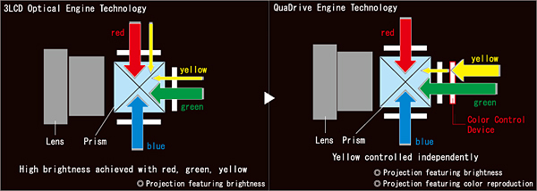 Из приведенной на сайте компании схемы не совсем ясно, почему независимый контроль желтого цвета должен приводить к повышению яркости и цветового охвата, видимо, причина в более полном использовании спектра излучения лампы.
