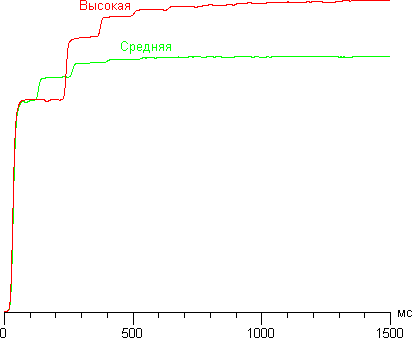 Зависимость яркости (вертикальная ось) от времени (горизонтальная ось) при переключении с черного поля на белое в двух режимах яркости.