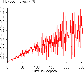 Для оценки характера роста яркости на шкале серого мы измерили яркость 256-ти оттенков серого (от 0, 0, 0 до 255, 255, 255) в режиме Динамическая при Яркость = +1. График ниже показывает прирост (не абсолютное значение!) яркости между соседними полутонами (яркость белого поля принята за 100%).