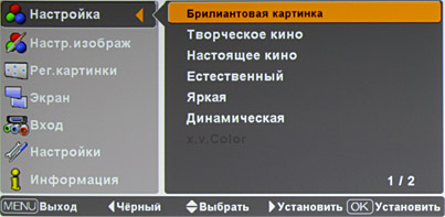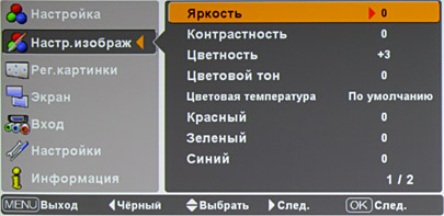 При этом следующий/предыдущий параметр перебирается стрелками вверх/вниз. Меню русифицировано, перевод в целом адекватный, но «Черный» на «Назад» так и не исправили, и «Брилиантовая картинка» осталась.