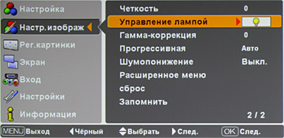Режим работы лампы (и системы охлаждения) проектора определяется параметром Управление лампой — можно принудительно включить высокую яркость, пониженную или выбрать один из двух автоматических режимов, в обоих яркость лампы будет повышаться для светлых изображений и понижаться для темных, но во втором минимальна яркость будет выше.