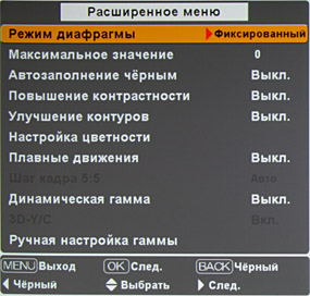В подменю Расширенное меню устанавливается режим диафрагмы (фиксированное значение, нормальная или высокая скорость автоматического изменения), выбирается величина максимального открытия диафрагмы, включаются функции Автозаполнение черным (повышение яркости темных участков яркого в целом изображения), Повышение контрастности (увеличение контрастности светлых участков за счет черных), Улучшение контуров (увеличение резкости цветовых переходов) и Динамическая гамма, а, выбрав пункт Ручная настройка гаммы, можно перейти к 9-тидиапазонной подстройке гамма-коррекции трех основных цветов.